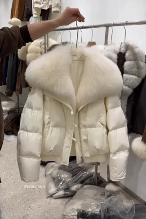 Luxurious White Down Puffer Jacket with Oversized Real Fox Fur Collar and High-Gloss Finish