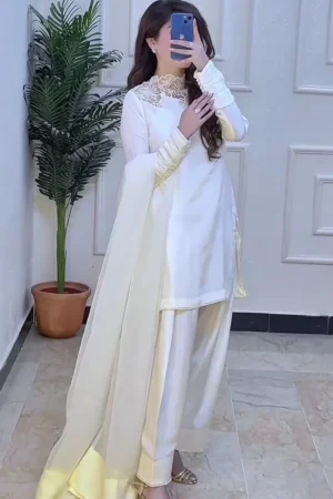 Elegant Ivory White Women’s Kurta Palazzo Set with Lace Neckline & Flowing Dupatta – Premium Ethnic Wear for Festive, Party & Formal Occasions