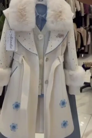 Elegant Girls’ Winter Overcoat Set with Faux Fur Trim and Floral Embroidery