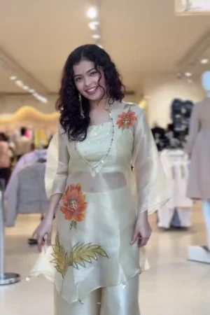Exquisite Ivory Organza Floral Hand-Painted Fusion Set – Elegant Three-Piece Occasion Wear with Shimmering Palazzo and Sheer Embroidered Shrug