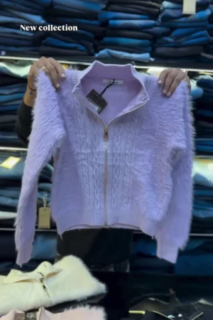 Luxurious Faux-Fur Cable-Knit Crop Cardigan – Ultra-Soft Fuzzy Full-Zip Sweater with High Mock Neck and Ribbed Trim for Winter Elegance