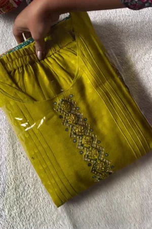 Vibrant Olive-Green Chanderi Kurta with Geometric Mirror-Work Embroidery, Pintuck Detailing, and a Contrasting Teal Bandhani Print Dupatta with Zari Borders