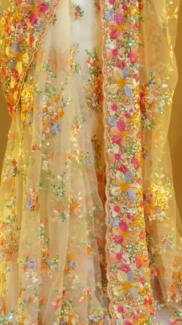 + Free ShippingThis breathtaking Designer Saree is a masterpiece of craftsmanship, perfect for weddings, galas, and high-profile celebrations. Crafted from a delicate, sheer fabric, it is adorned with a garden of multi-colored floral embroidery and shimmering sequins that capture the light with every movement.