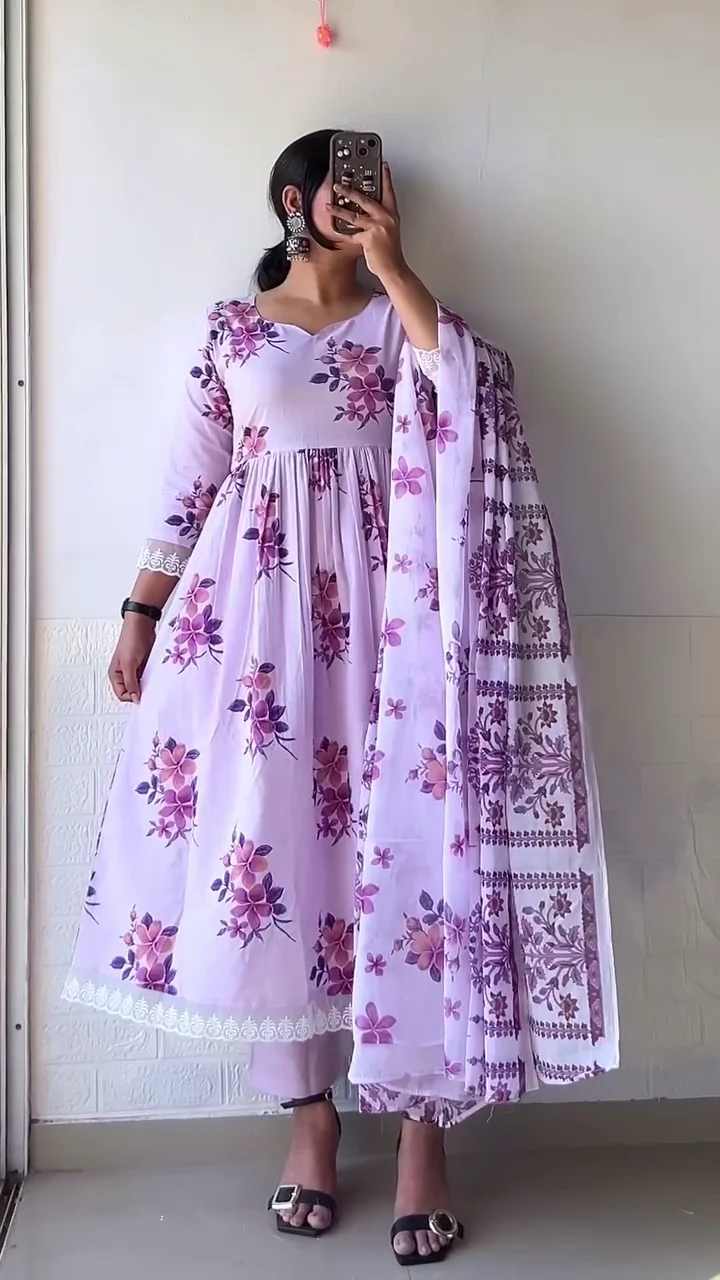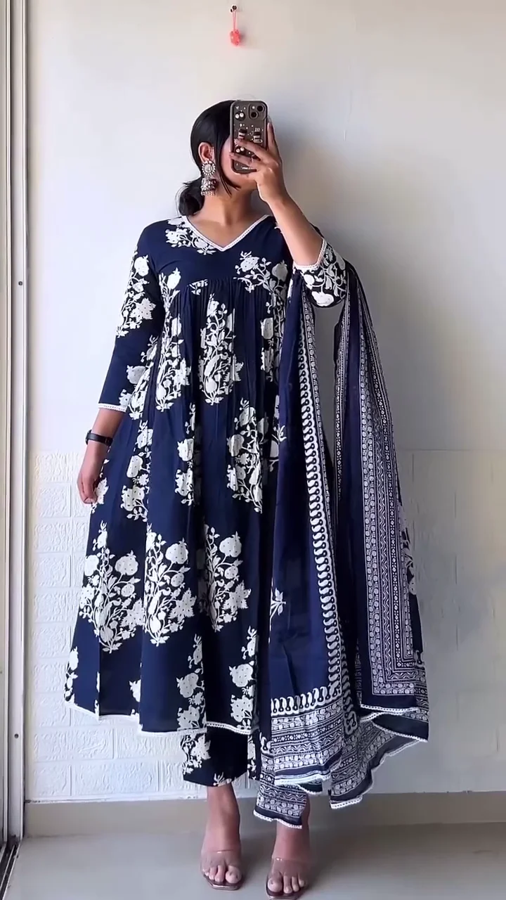 Be the first to review “Premium Floral Print Cotton Anarkali Kurta Set with Matching Dupatta and Pants – Elegant Ethnic Occasion Wear for Women (Available in Navy Blue & Lavender)”