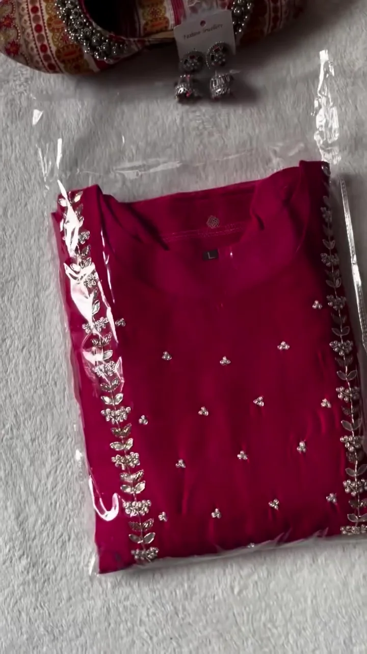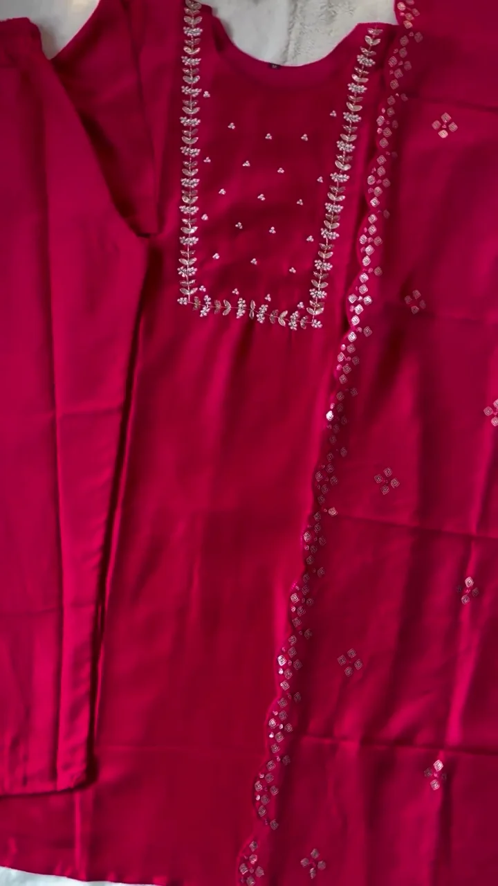 Be the first to review “Radiant Magenta Kurta Set with Intricate Silver Zari Foliage Embroidery and Scalloped Border Organza Dupatta featuring Hand-Placed Sequin Accents”