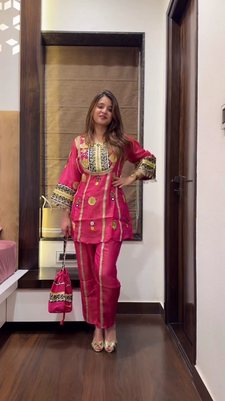 • Intricate Neckline & Borders: The pink set showcases a heavy, multi-colored embroidered yoke with mirrors and gold vertical patti work for a slimming, elongated silhouette.