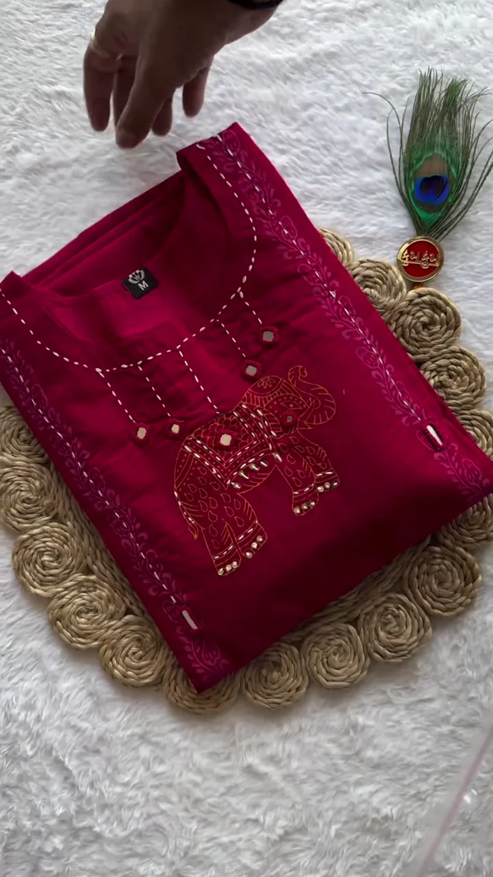 Vibrant Magenta Cotton Kurta with Heritage Elephant Embroidery and Mirror Accents