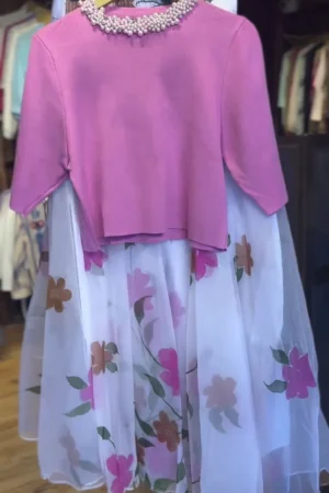 Elegant Two-Piece Ensemble: Pearl-Embellished Mauve Knit Top and Floral Organza Layered Midi Skirt
