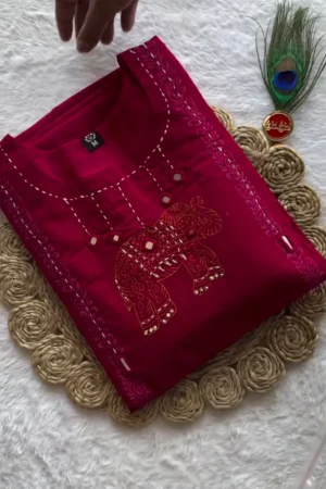 Vibrant Magenta Cotton Kurta with Heritage Elephant Embroidery and Mirror Accents