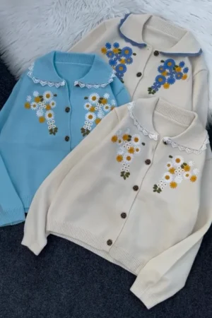 Stylish Embroidered Flower Cardigan with Lace Edge Collar for a Feminine Look