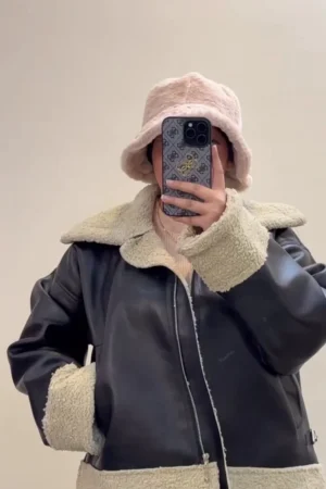 Warm Oversized Shearling-Lined Leather Coat with Adjustable Hem and Side Buckles